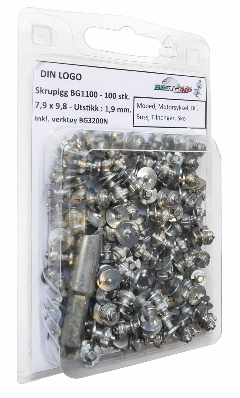 100 stk. pigger inkl. verktøy, pakket i blister.