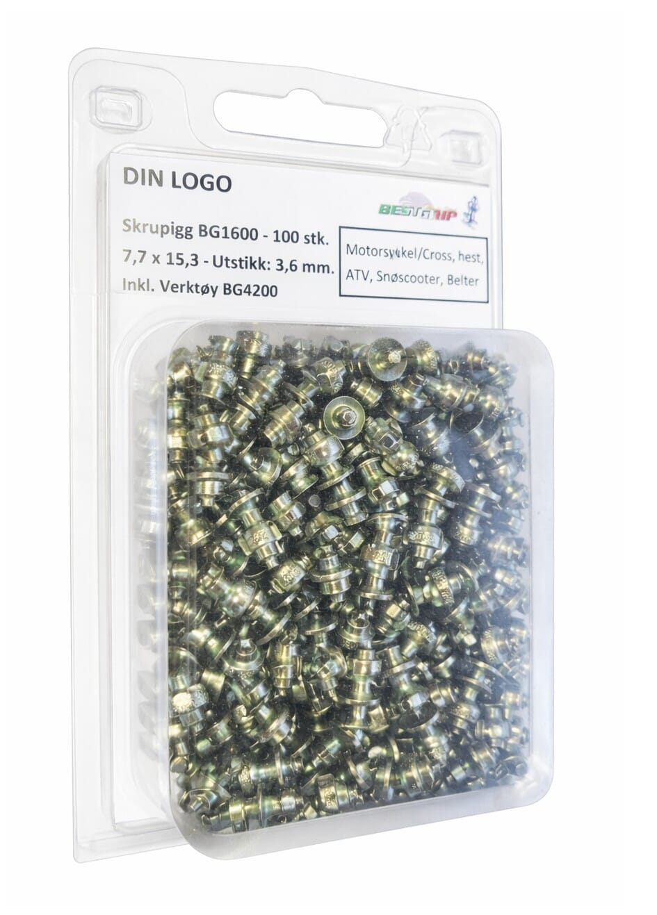 100 stk. pigger, pakket i blister. Inkl. Verktøy (BG4200).