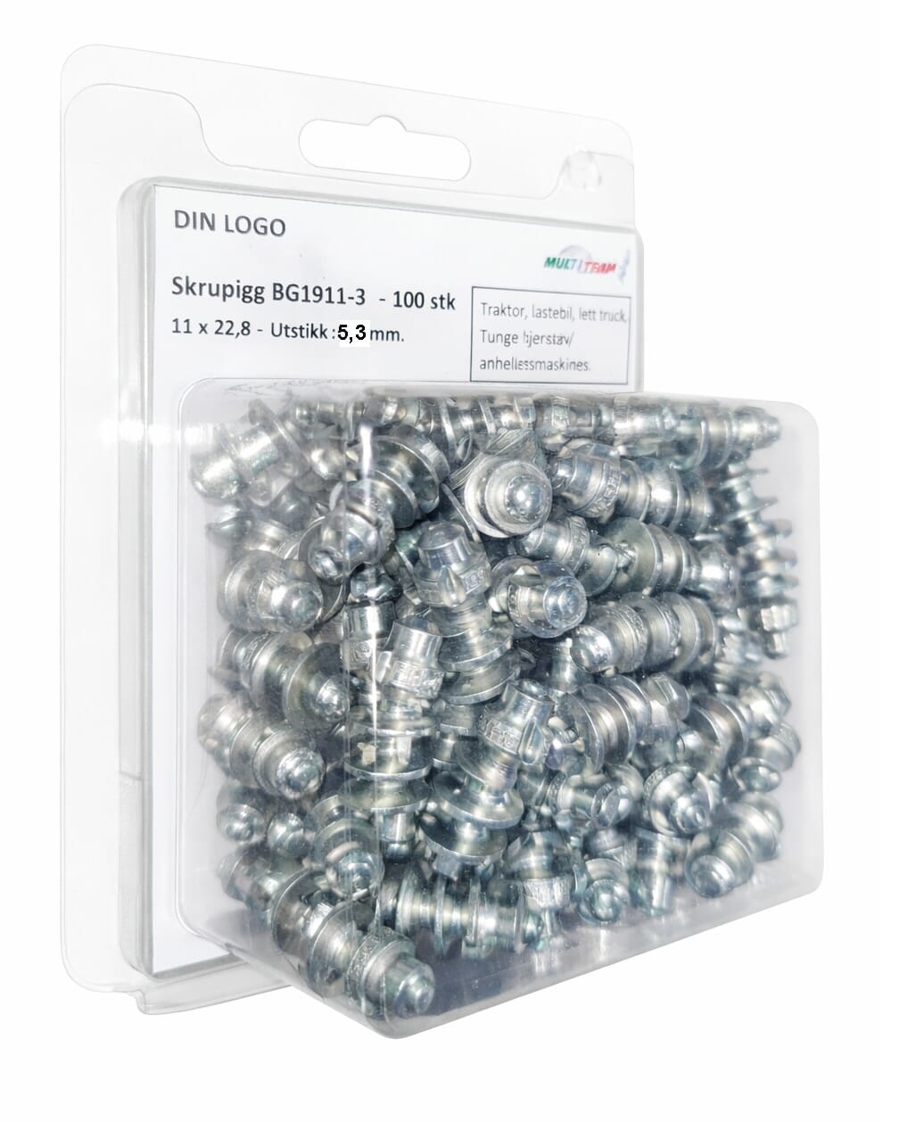 100 stk. pigger, pakket i blister. Verktøy bestilles separat (BG4911-3).
