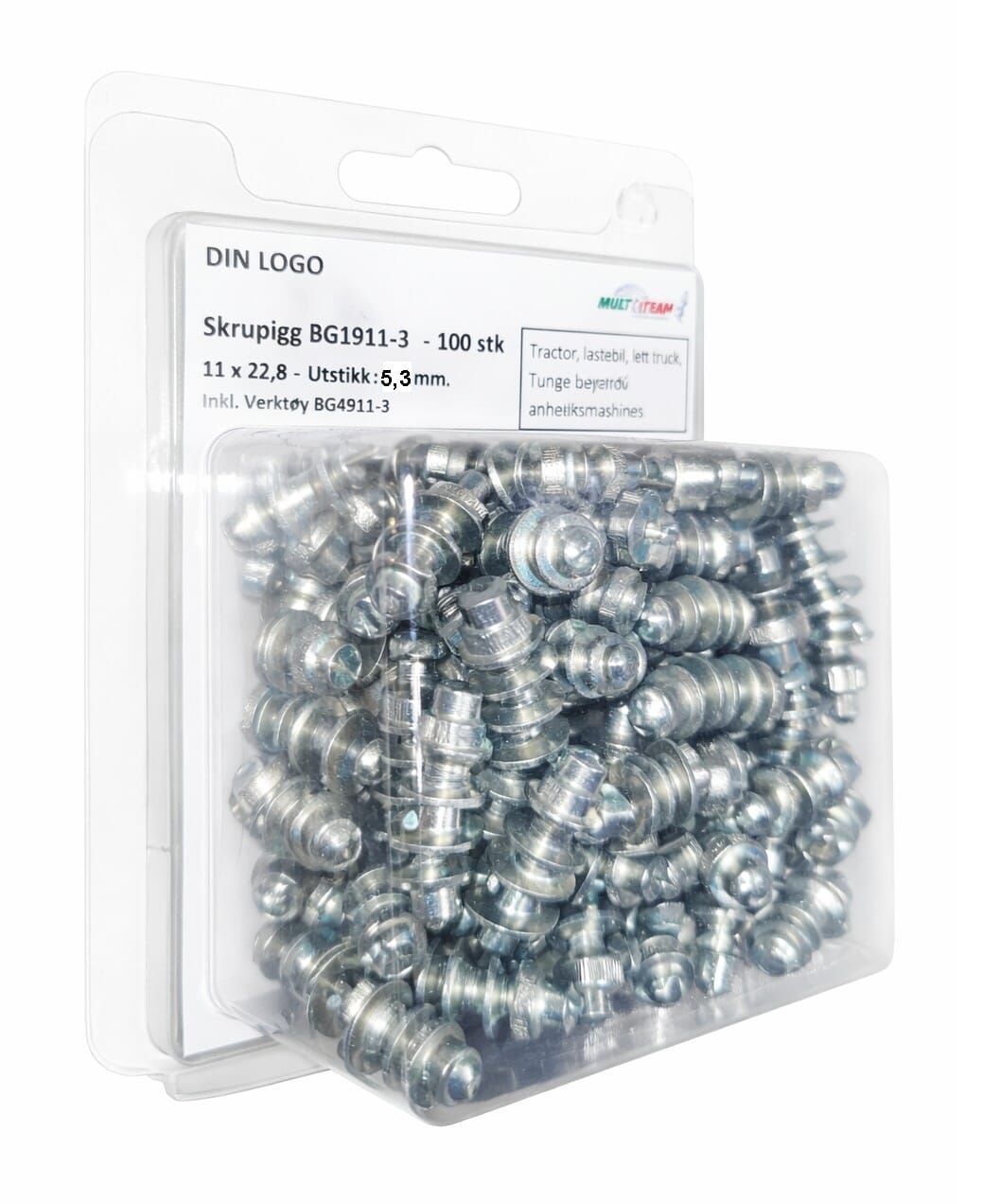100 stk. pigger, pakket i blister, inkl. verktøy (BG4911-3).